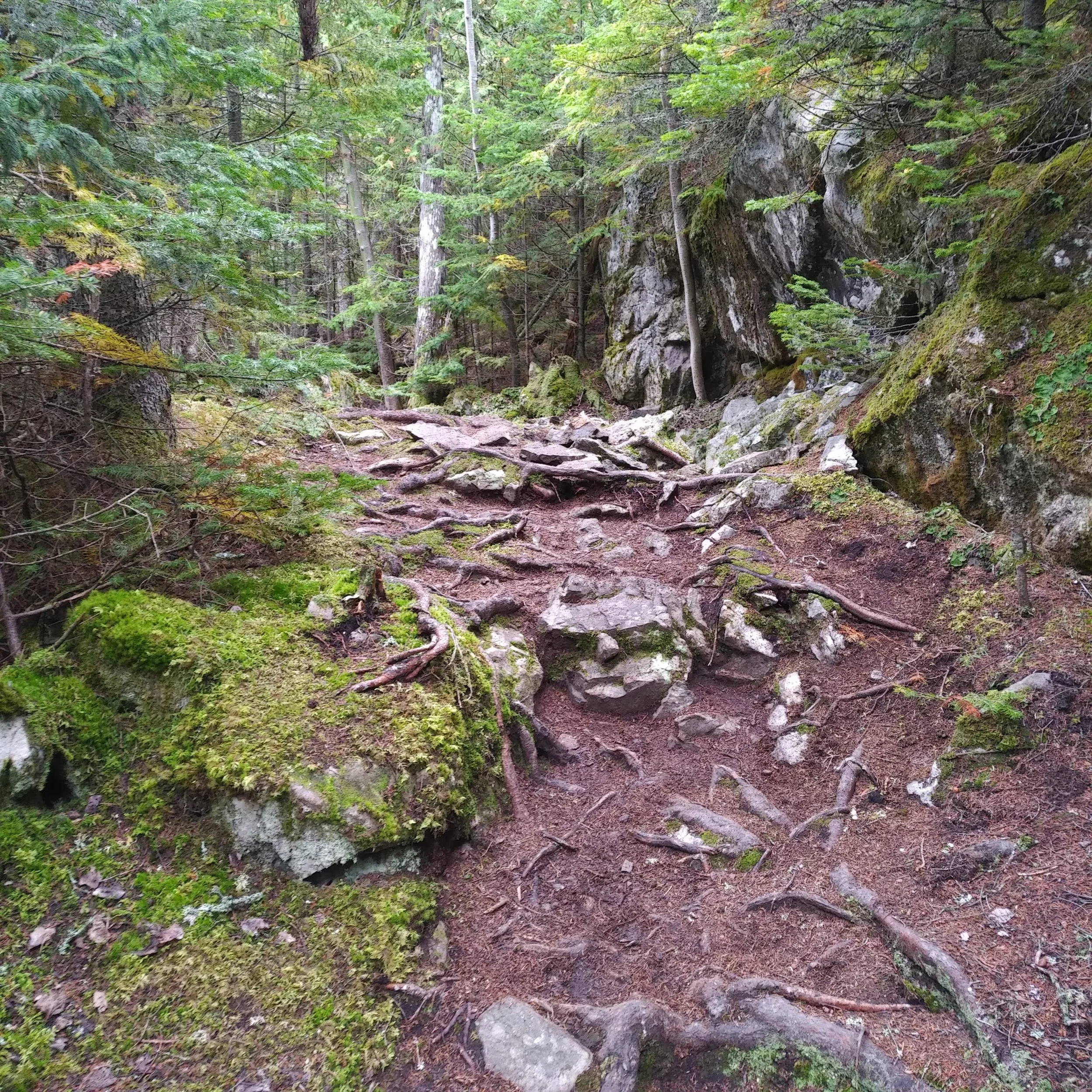 The race started at the trailhead of the Sentiers Les Lacs trail in the west end of Forillon National park. The trail is part of the International Appalachian Trail. The trail starts climbing pretty much right away. I knew from the elevation profile that most of the first ten kilometres I would be climbing, so I took it slow and didn't push too hard, just keeping a nice steady fast hiking pace on the way up and running whenever it flattened out. This section wasn't nearly as challenging as I expected (I imagined it being similar to climbing Tremblant, but it was much gentler). There were a lot of trees down from the wind storm the night before, but we could get around all of them easily.